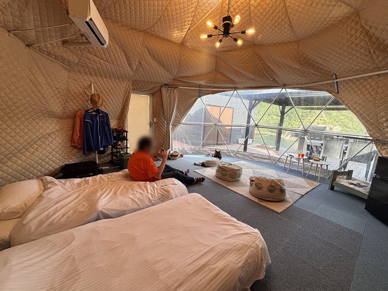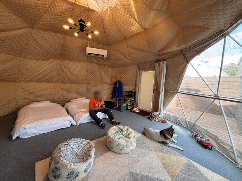 ドーム型のテントの中に、ベット、冷蔵庫、エアコン完備の手ぶらで行ける、