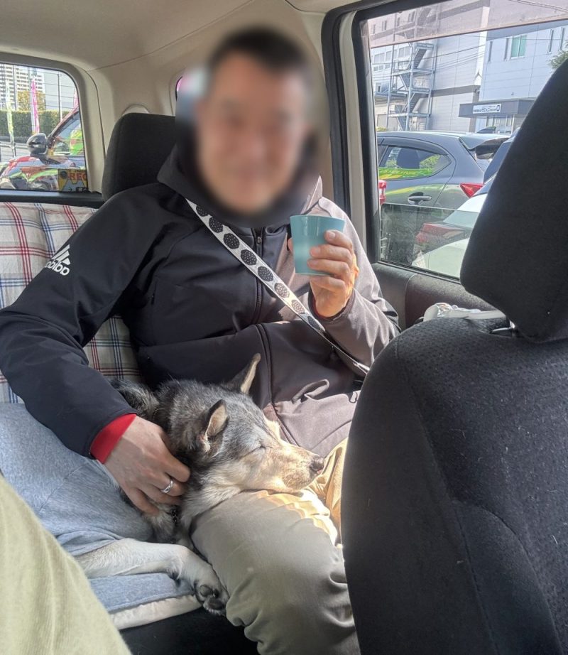 で、一緒に車でギャラリーへ。幸せそうに、膝の上に顎乗せてる。
